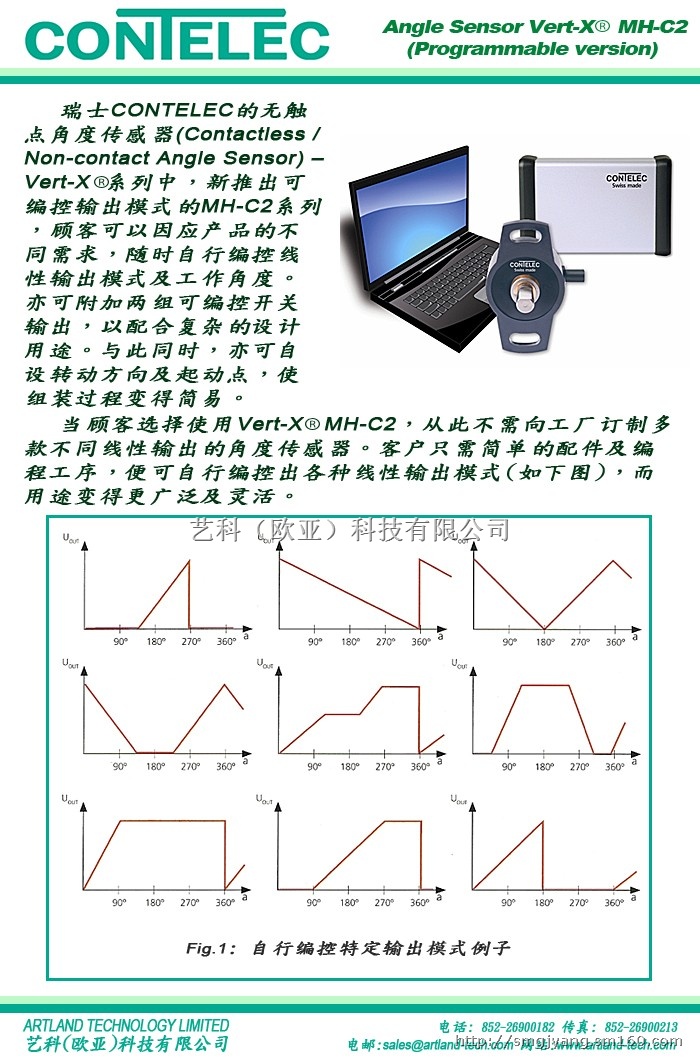 瑞士康德勒(CONTELEC)的无触点角度传感器(CONTACTLESS / NON-CONTACT ANGLE SENSOR),新推出可编控输出模式的Vert-X?MH-C2系列,客户只需简单的配件及编程工序,便可随时随意自行编改传感器的输出模式,而且另附设两组可编控的开关输出,可配合复杂及多功能的机械或产品用途。