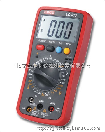 LC812是3 1/2位手持式数字万用表,功能齐全,性能稳定,结构独特,安全可靠。配以全功能过载保护,本仪表护套采用反扣工艺,使外壳具有足够的绝缘性能和抗震性能;仪表设有手动开启背景光功能,方便用户在较暗的场所读取测量显示值,为安全、有效的使用仪表提供了有力保障。本仪表是一款功能很齐全的通用万用表,可用于测量:交直流电压和电流、电阻、电容、频率、温度、二极管、稳压二极管、三极管、电路通断等功能。