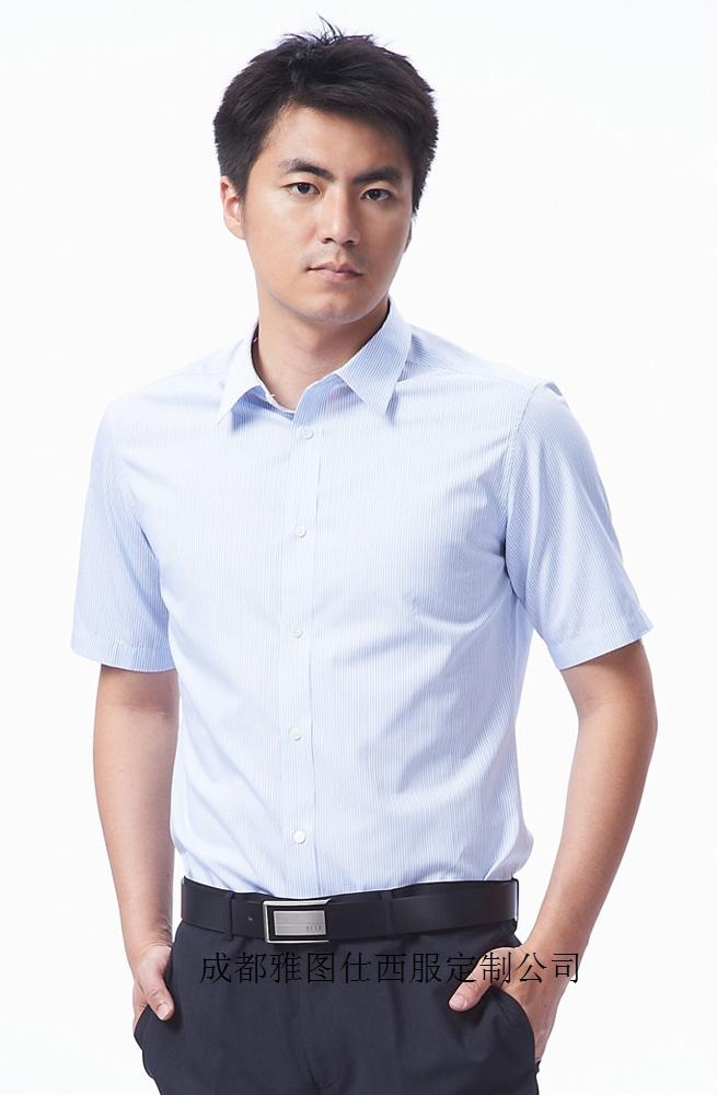 此款采用全棉面料,天然,舒适,健康。具有穿着凉爽,手感柔软,耐穿,和有一定的防静电性能,面料触到肌肤不会感到不舒服和痒的征兆。此款标准男式衬衣,八字领明门襟。采用白底浅蓝条纹,代表着自信,大方,大气等此款适合于商务会谈。让您从容的面对一切困难。成都男式衬衫定制,定制各种衬衣,衬衫,T恤,西服等