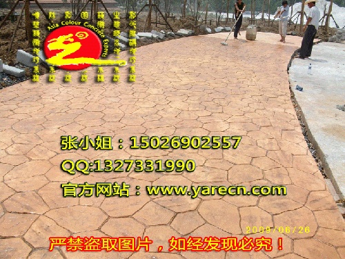 艺术地坪材料-彩色强化料,彩色脱模粉,光亮密封剂,这三种材料为艺术地坪-压模地坪材料,睿龙彩色强化料,用于撒在初凝的混凝土表面,且相应的工具光平彩色强化料,睿龙彩色脱模粉,撒在已撒有彩色强化料的光平后混凝土表面上,紧接着用相应的模具压模,后期通过冲洗,涂上光亮密封剂,即可完工,通过睿龙艺术地坪压模地坪(彩色强化料,彩色脱模粉,光亮密封剂),我们公司生产的这三种材料而铺装出的道路,其整体性强,抗压抗折强度高,不变色,不粉化,经久耐磨,其材料质优价廉,上海亚睿在上海立足十年有余,其工艺不仅相当成熟,而且材料质地一路领先!
