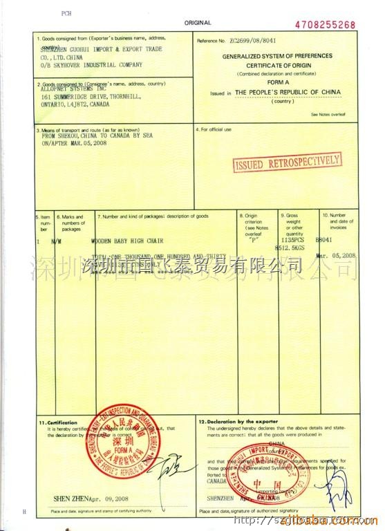 8.一般产地证(C/O) 一般原产地证书是证明货物原产于某一特定国家或地区,享受进口国正常关税(最惠国)待遇的证明文件。它的适用范围是:征收关税、贸易统计、保障措施、歧视性数量限制、反倾销和反补贴、原产地标记、政府采购等方面。