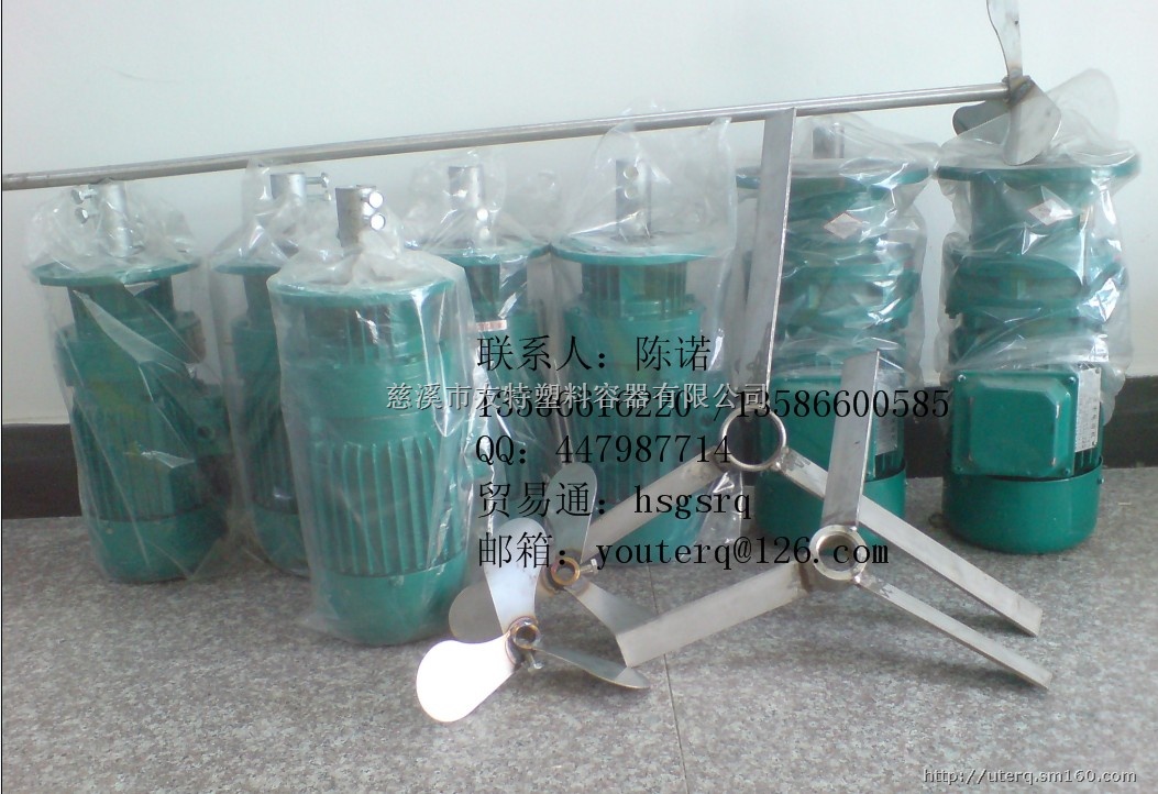 搅拌机采用优质电机和减速机组合而成,本厂搅拌机设定转速为130转,特殊使用转速可调配。功率在0.18KW到22KW之间。搅拌杆和叶轮采用304不锈钢制作,轴粗和轴长及叶轮大小层数可调配。一般建议200L以下加药箱配置0.18KW,轴长600,叶轮直径为200,采用3叶一层。300L为0.37KW /500L为0.55KW, /1吨为0.75KW、1.1KW, /2-3吨为1.1KW、1.5KW、2.2KW。具体要根据液体粘性稠度以及容积量来定参数。产品质保期为1年