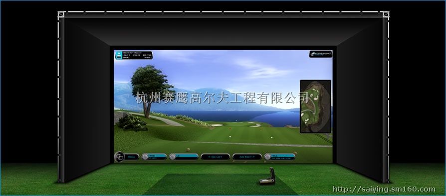 中间位投影屏幕,投影机将虚拟的高尔夫球场投射到正中间的投影幕上,投影幕两边的侧墙是软包结构,就高尔夫的使用功能要求而言,单屏模拟高尔夫已经能全部满足。