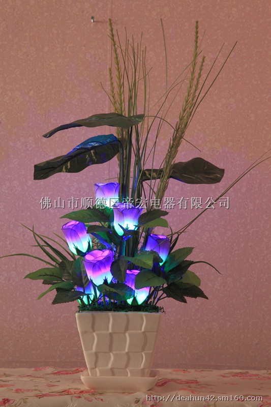 7朵紫色直筒玫,9颗蓝灯珠,3枝龟背叶,1枝麦草,玫瑰叶,野花+白色正方盆