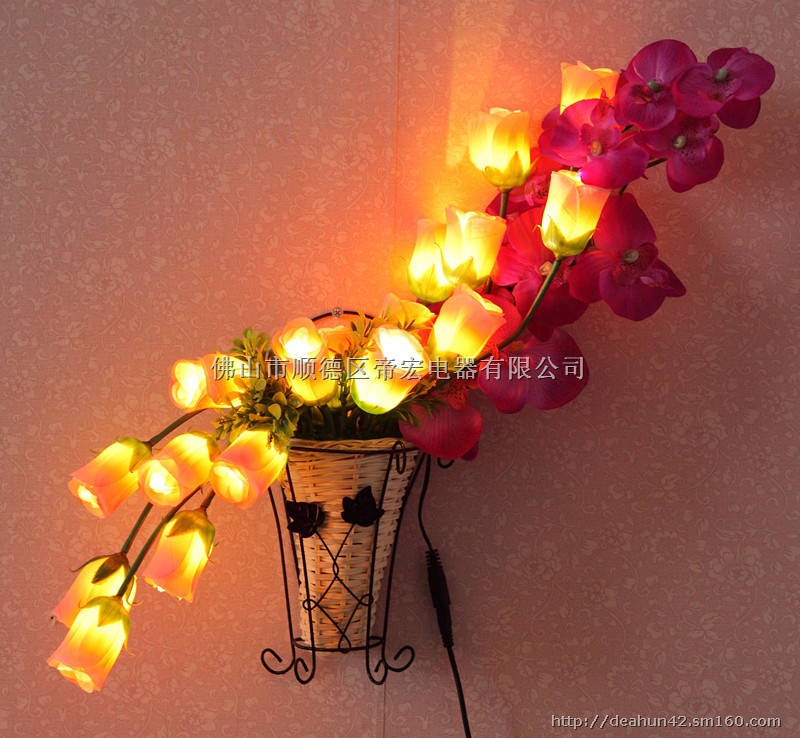 18朵粉色直筒玫,18颗白灯珠,2枝蝴蝶兰(紫色)+米兰叶+咖啡色挂篮
