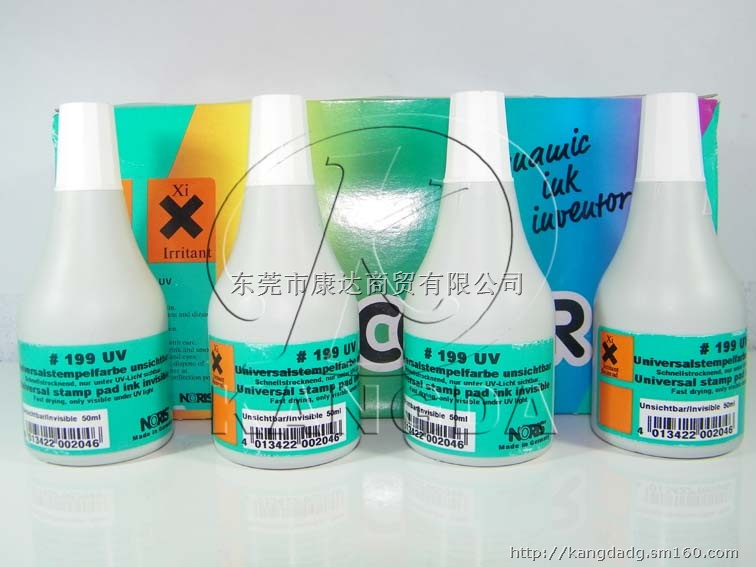 1. NORIS诺丽色#199UV是快干型隐形印油,正常光线下不可见.在紫外光照射下发兰色荧光.