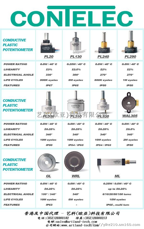 我司诚意向顾客们推介瑞士康德勒(CONTELEC)的导电塑料专业电位器(Conductive Plastic Potentiometer),此系列电位器的寿命高达一千万次,加上高精密度的线性输出及分辨率,能广泛地应用于要求准确及重复频密移动的机械设备之上.例如: 漂染机,织布机,丝印机,注塑机,半导电体设备,自动化机械臂及火车设备等。