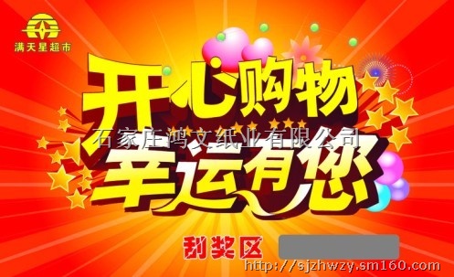 刮刮卡是指用铜版纸、PVC、PET等材质制作成的较小面积的印刷品。卡体正面图案由企业产品和企业LOGO组成,并在正面的位置做去一个“刮开区”,此区内可设置不同比列的奖项或中奖信息在内。刮开区通过丝网涂上一层银层(印刷术语叫刮刮银),卡体背面印有:商家的活动说明或奖项说明等等内容。银层把刮开区内的内容完全盖住,这样在商家活动时,消费者现场刮开时才能知道里面的内容,起到保密的作用。