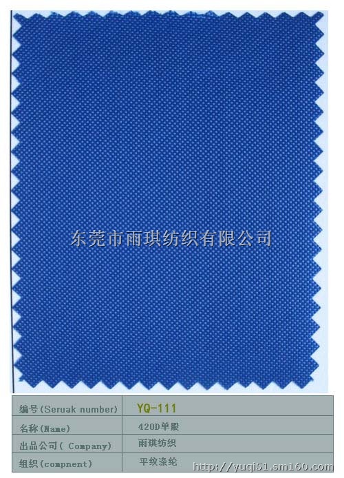 雨琪纺织是一家专业从事军用牛津布、耐磨牛津布、环保牛津布、TPE牛津布、TPU牛津布、提花牛津布阻燃、防火牛津布、抗紫外线牛津布,第一品牌。经过12年的发展,现已初具规模。厂房面积9.8万平方米,拥有双喷双泵、高速多臂、高速剑杆等各类进口织机480台套,全电脑数控整浆并3套,自动化高速分条整经机5套,倍捻机和其它设备配套,设施齐全。此外,我司还投资兴办了涂层厂。可来样加工,也可根据客户需要进行防水、防绒、PA、PU、优丽胶、阻燃防火、抗UV防紫外线、宇璐、涂金银珠光、涂油感蜡感、透气透湿等涂层和PVC压延、发泡等各种后整理,产品竞争优势明显。各兄弟关系企业与我司分工合作、强势突出、优势互补,从而集开发、织造、染色、涂层加工及贸易销售一条龙优质高效地为客户服务。我们的销售网络分布在:华南、华北、佛山、中山、深圳、广州、宁波、上海等地方和地区.东莞牛津布厂家首选雨琪纺织,雨琪牛津布最好的东莞牛津布厂家www.rainqi.com 雨琪纺织16年研发经验,做全球最专业的提花牛津布第一品牌!