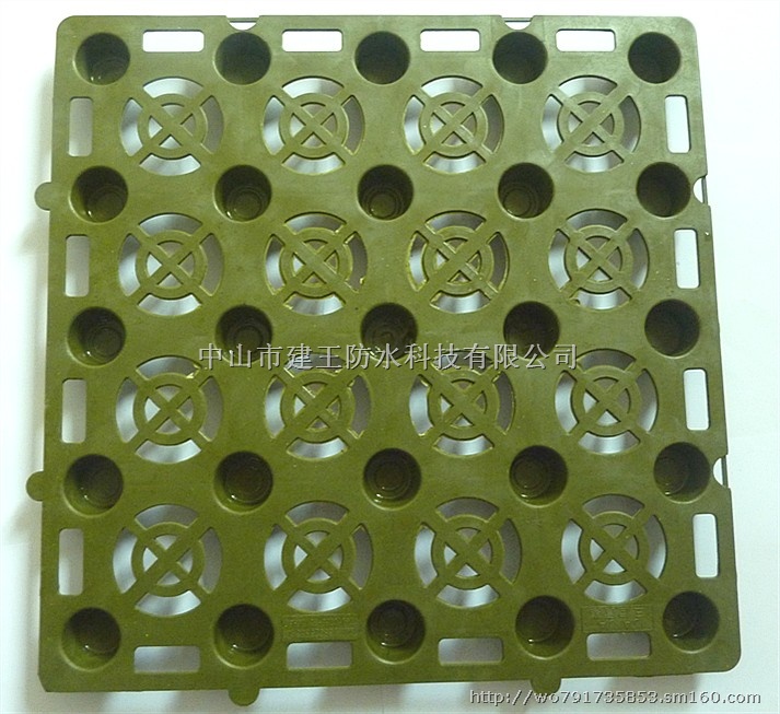 中山市建王防水科技有限公司, 邮箱:kf@cnjianwang.com .联系人:杨荣生手机:13715628632 手机:15016122754、网址、www:cnjianwang.com.蓄排水板由PP注塑成型,主要用于屋顶花园绿化、车库顶板绿化、高尔夫球场、公共建筑绿化、广场绿化、园区内道路绿化工程。产品在德国汉堡、柏林屋顶绿化工程中有广泛应用,效果良好。产品自德国进入中国市场以来,已被香港贝尔高林、泛亚易道景观、汉森国际,土人景观设计等推荐使用,已成功用于各种大型房地产项目。 蓄排水板常用JX-24技术参数: 1.蓄水指标:每平方正常蓄水>4公斤。据德国汉堡专业屋顶绿化系统RAIN公司,气温20摄氏度-27摄氏度,湿度80%,毛细供水可提供薄层绿化系统十天用水。2.抗压强度:580kpa,可承载3.0M以上种植土及绿化树木系统荷载。3.产品耐候性:在-40摄氏度-60摄氏度均可正常使用。4.耐老化使用年限:材料组成为改性PP,为50年以上难分解物质。耐老化测试:氙灯老化1000小时,性能不变。5.排水指标(L/S):水头损失5cm 3.6 水头损失10cm 5.0,完全达到强降水、排水要求。6.颜色:草绿色、墨绿色。可根据客户要求订制。7.重量:每块重250g左右。8.产品适用:屋顶花园、车库顶板、高尔夫球场、公共建筑、广场、园区道路等绿化工程。9.产品优点:排水均匀,改善排水效果,储备绿化用水、水分储量大,调节水分供给,保温保湿、节水节能,土壤透气性好,有利于植物对氧气和水分的吸收,承载力大,荷载轻,施工简单轻便,耐久环保。蓄排水板(共3种规格)兼具雨水排疏与收集双向功能,蓄水排水量大。结合土工布一起使用,可以避免细颗粒基质堵塞排水通道,保持排水通畅和空气流通,从而形成一个完整的、新型的组合过滤蓄排水系统,是传统滤水材料的良好替代品。 蓄排水板规格:DW-333蓄排水板规格尺寸:333mm*333mm*25mm*9片/平方米DW-378蓄排水板规格尺寸:378mm*378mm*25mm*7片/平方米DW-396蓄排水板规格尺寸:396mm*396mm*25mm*6.5片/平方米DW-396蓄排水板规格尺寸:396mm*396mm*20mm*6.5片/平方米DW-396蓄排水板规格尺寸:396mm*396mm*25mm*6.5片/平方米(加厚加强型) 规格齐全,可根据要求定制各种颜色。 蓄排水板的应用。一、园林工程:车库顶板绿化、屋顶花园、屋顶绿化、足球场、高尔夫球场、浴场工程等。二、市政工程:道路路基、地铁隧道等。三、建筑工程:建筑物基础上层或下层、地下室内外墙体、屋面防渗和隔热层等。