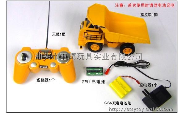 功能:四通道遥控车,前进、后退、左转、右转,高性能马达,封闭式底盘,车厢上升、车厢下降、 灯光前照功能,配原装充电池和充电器