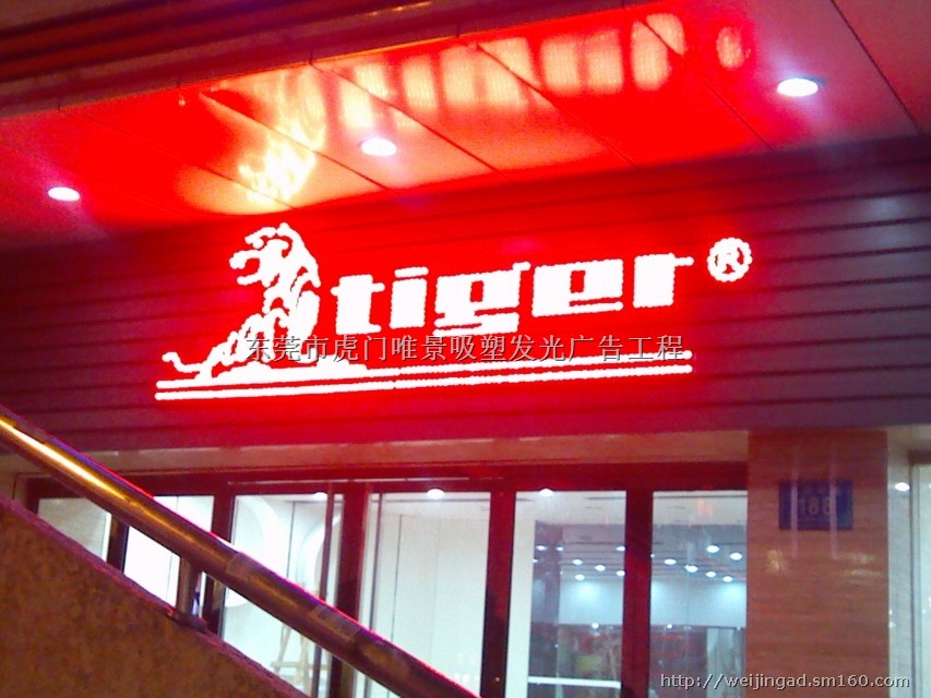 3、不受字的颜色的限制:一般内发光字受有机板的限制,如红色吸塑字,一般里面放的也是红色光源,发出来的也是红光,而外露发光字则不然,你可以将字烤成各种颜色的漆,晚上你需要亮什么颜色的灯就亮什么色的灯,一点不受底字的影响,而且大字由于离地面高,白天,LED外露的灯也不明显。