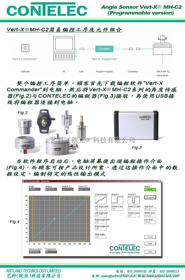 瑞士康德勒(CONTELEC)的无触点角度传感器(CONTACTLESS / NON-CONTACT ANGLE SENSOR),新推出可编控输出模式的Vert-XMH-C2系列,客户只需简单的配件及编程工序,便可随时随意自行编改传感器的输出模式,而且另附设两组可编控的开关输出,可配合复杂及多功能的机械或产品用途.详情可参考下列Vert-XMH-C2系列的简介。