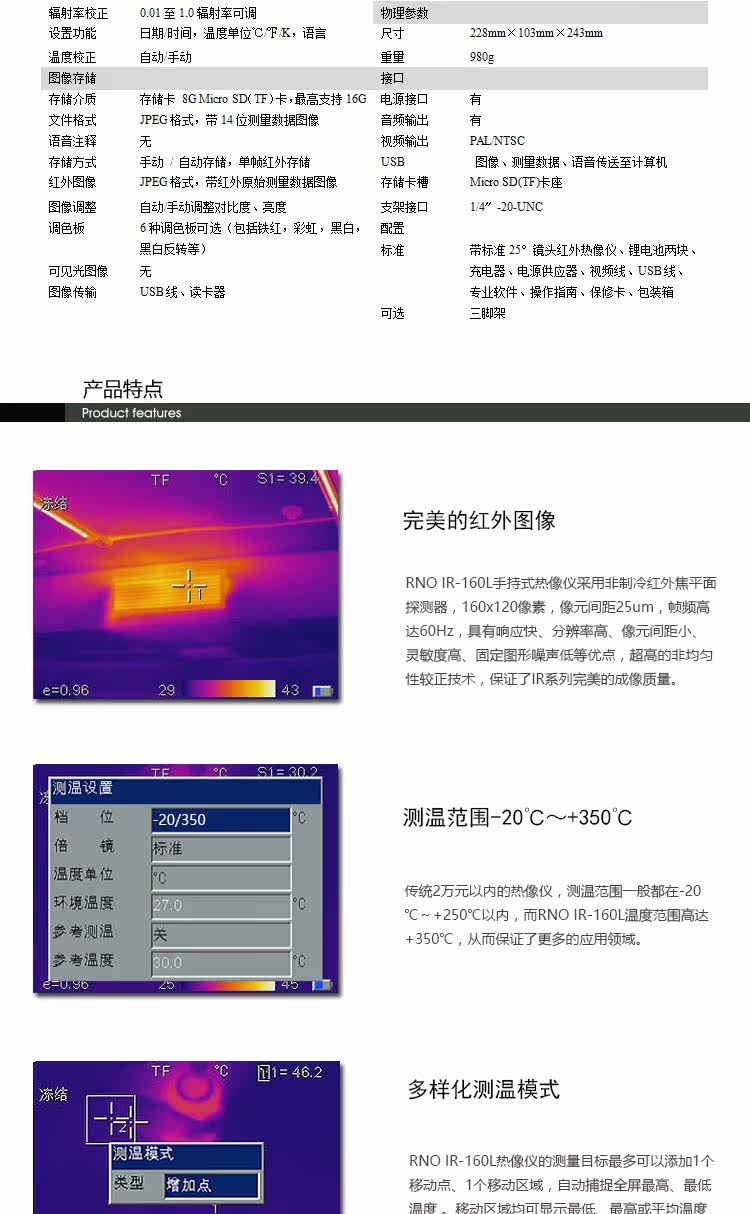 | 存储介质 | 存储卡 8G Micro SD(TF)卡,最高支持16G | | 文件格式 | JPEG格式,带14位测量数据图像 | | 语音注释 | 无 |