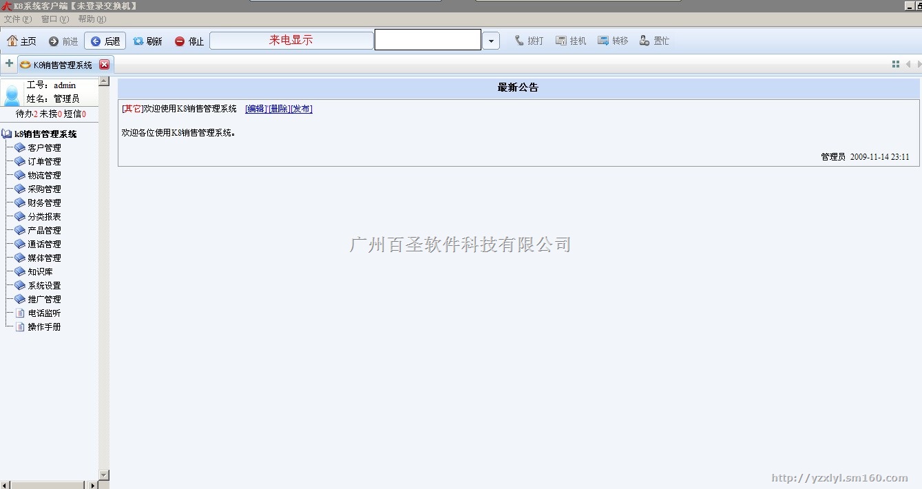 K8电话销售系统,目前市场上根据电话销售行业行业量身定做的集呼叫中心(Call Center)、客户关系管理(CRM)、订单管理、物流配送、进销存管理,财务管理于一体最专业的的销售管理系统,能够高效管理客户资源、提高进线客户下单率、流程化管理订单从下单、审核、发货、收退货以及快递公司结算,结合仓库的进销存管理,有效的将公司销售部门及各后勤部门统一在同一平台上高效的开展协同工作。