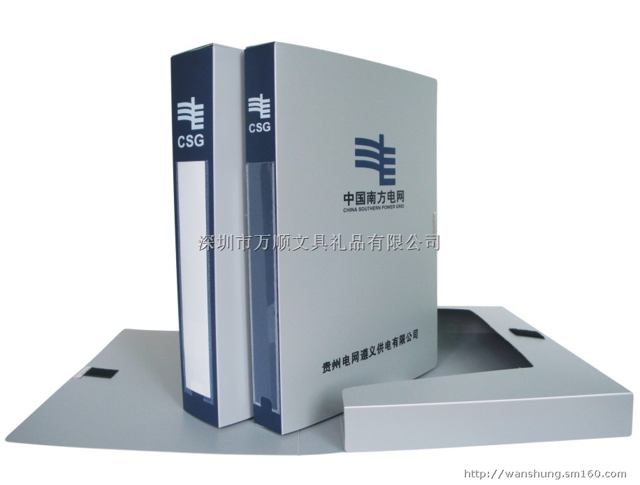 深圳市万顺文具礼品有限公司专业制作国家电网、南方电网、各企事业单位CI产品,欢迎定制:档案盒、资料册、文件夹、纸板夹、风琴包等产品,印刷、烫金您的个人或公司logo。 优质环保原材料生产,环保,对人体无害,