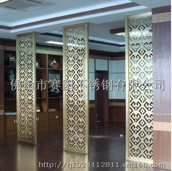 不锈钢屏风(花格)作为传统家具的重要组成部分,历史由来已久。彩色不锈钢屏风一般陈设于室内的显著位置,起到分隔、美化、挡风、协调等作用。它与家具相互辉映,相得益彰,浑然一体,成为家居装饰不可分割的整体,呈现出的独特的美感。不同造型的不锈钢屏风,可以跟据环境的不同进行创新性的设计,做到外观精美,产品与实际环境统一协调,满足客户不同的需求。不锈钢屏风(花格)通常通过板材的剪板,激光,刨槽,折弯,焊接,精抛成型,电镀制作成为成品,部分产品使用不锈钢管焊接+抛光+电镀成型。表面效果可供客户需要选择砂光板、拉丝板、8k镜面板、钛金板、玫瑰金板、香槟金、仿铜板、古铜板、青铜、红铜、黑钛板、七彩板等各种彩色不锈钢系列。材质为201或者304不锈钢,高要求的可用316不锈钢。