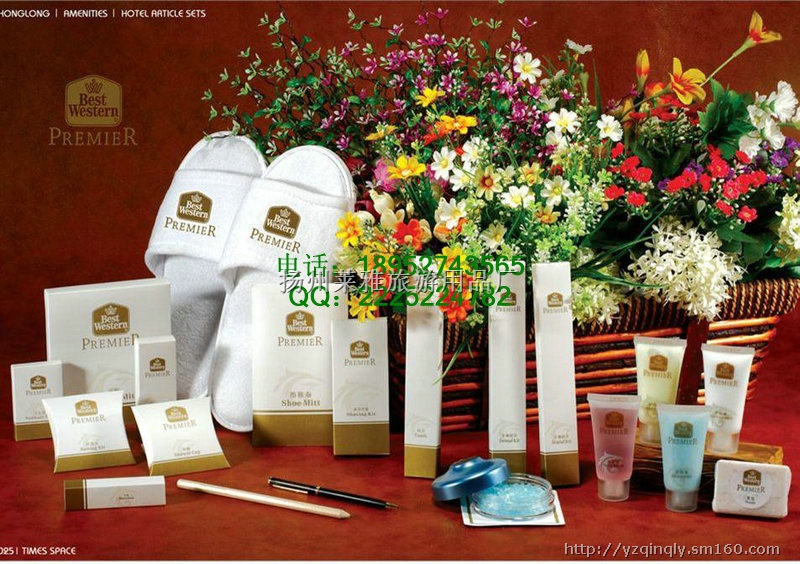 牙具;香皂;梳子;高中档毛巾拖鞋;无纺丝拖鞋;瓶装(软管装)洗发液;瓶装(软管装)沐浴液;润肤露;护发素;浴帽;指甲锉棉签;服务指南;塑料袋制品;浴地面等毛巾;剃须刀;针线包、擦鞋器、针线包、袋泡茶、圆珠笔、夹纸笔、口杯垫、吸水口杯垫、火柴、洗衣袋、购物袋、大、小垃圾袋、托盘、垃圾桶、服务指南、酒水夹、标牌、面巾、方巾、浴巾、地巾、床罩、床单、被子、被套、枕芯、枕套、护床垫、毛毯、遮光一体窗帘、浴帘等高级宾馆、酒店用品