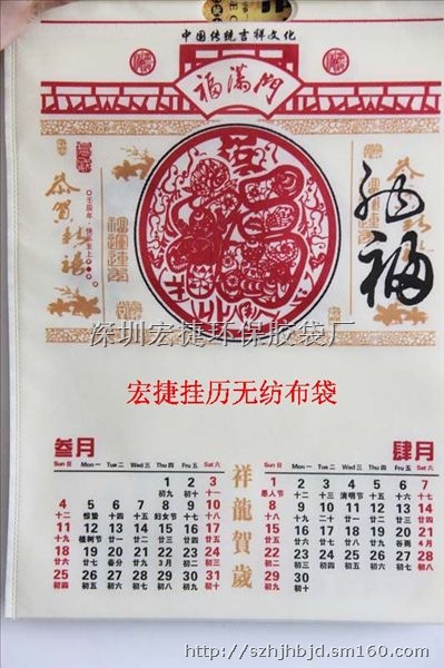 无纺布挂历也叫环保无纺布挂历,无纺布袋挂历,是一种新型的环保绿色产品,是企业宣传、广告、文化传媒、商务赠品、礼品等行业首选的环保产品。这种环保无纺布挂历主要材质是无纺布,无纺布是一种非织造布,它直接利用高聚物切片、短纤维或长丝通过各种纤网成形方法和固结技术形成的具有柔软、透气和平面结构的新型纤维制品,在无毒的形态中进入下一步环境循环,一个无纺布袋在室外环境90天内就可以彻底分解。无纺布挂历正是以环保无纺布袋为主体、添加艺术性欣赏设计为依托,极佳地溶合了实用、环保、艺术完美结合的新时代环保理念,令人耳目一新。 环保无纺布袋是一种绿色产品,坚韧耐用、造型美观,透气性好,可重复使用、可洗涤、可丝印广告、使用期长,适宜任何公司、任何行业作为广告宣传、赠品之用。无纺布袋挂历价廉物美,环保实用,应用广泛,有突出的广告效应市场。使用完挂历后可以简单拆下当环保袋使用,使企业广告走出户外达到更好的广告宣传。底面可以当作画长年挂在家里作为装饰。印刷采用彩色印刷,图案精美、可视效果极佳,可作为平常往来礼品、赠品之用。用于各类业务活动及展览展销会,是企事业单位理想的广告促销、礼品赠品。