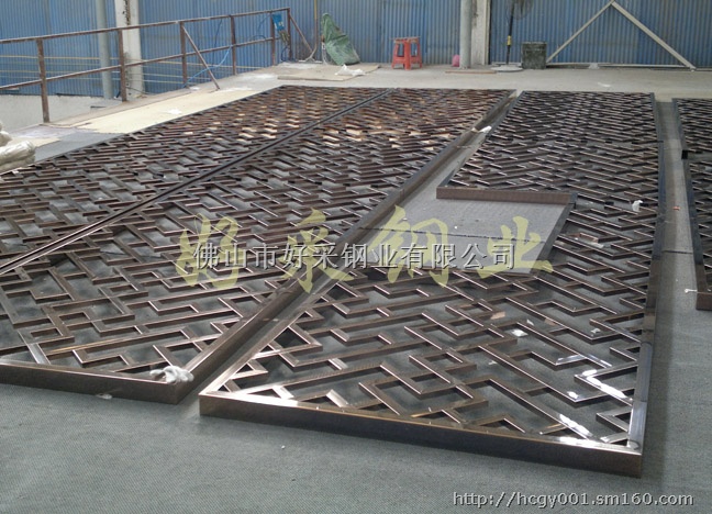 好采设计的这一款不锈钢香槟金屏风,时尚,大胆,相比其它不锈钢屏风尽有大不同之处,如:不锈钢KTV屏风,不锈钢酒店工程屏风,玫瑰金不锈钢中式花格屏风等.这些屏风花格都是采用中国的古式背景图案,有种古式味道,而不锈钢香槟金屏风,正反二面图案不对称的制作,让人感觉错乱又有错乱之美.这款屏风主要的工艺是先以板材激光好板块后再焊接而成.