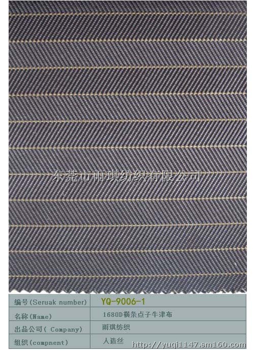 雨琪纺织是一家专业从事军用牛津布、耐磨牛津布、环保牛津布、TPE牛津布、TPU牛津布、提花牛津布阻燃、防火牛津布、抗紫外线牛津布,第一品牌。经过12年的发展,现已初具规模。厂房面积9.8万平方米,拥有双喷双泵、高速多臂、高速剑杆等各类进口织机480台套,全电脑数控整浆并3套,自动化高速分条整经机5套,倍捻机和其它设备配套,设施齐全。此外,我司还投资兴办了涂层厂。可来样加工,也可根据客户需要进行防水、防绒、PA、PU、优丽胶、阻燃防火、抗UV防紫外线、杜邦三防、涂金银珠光、涂油感蜡感、透气透湿等涂层和PVC压延、发泡等各种后整理,产品竞争优势明显。各兄弟关系企业与我司分工合作、强势突出、优势互补,从而集开发、织造、染色、涂层加工及贸易销售一条龙优质高效地为客户服务。我们的销售网络分布在:华南、华北、佛山、中山、深圳、广州、宁波、上海等地方和地区.东莞牛津布厂家首选雨琪纺织,雨琪牛津布最好的东莞牛津布厂家www.rainqi.com 雨琪纺织16年研发经验,做全球最专业的提花牛津布第一品牌!