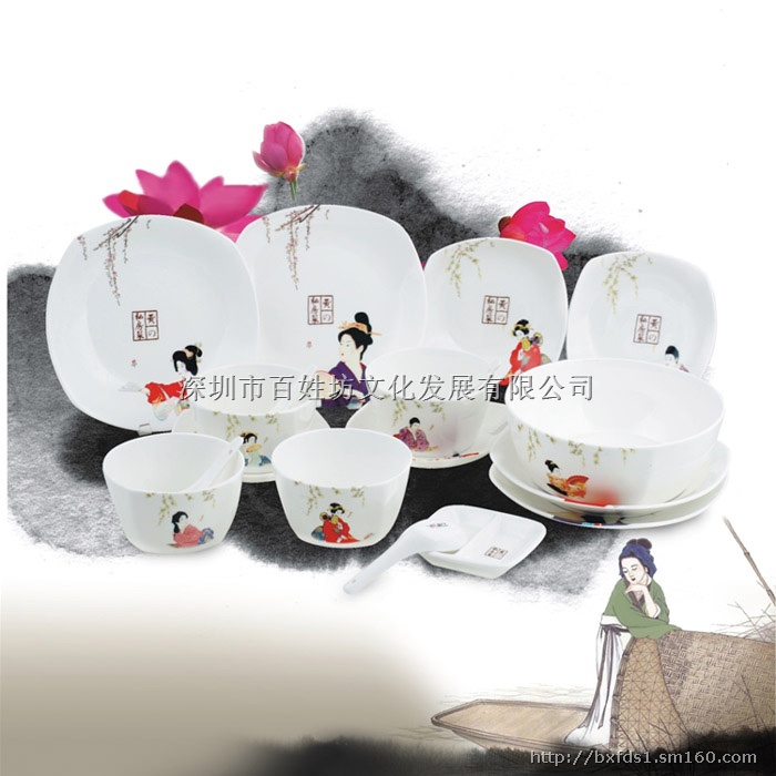 四人用百姓坊骨瓷餐具【日式私房菜餐具套装】,日式风格,白皙的瓷面上是日本浮士绘画风的清纯柳腰美人,色泽柔和,清新素雅,别致而有品味,洋溢着一种家庭祥和、温馨的气氛,具有日本文化所独特的小资情韵。瓷器造型别致,尊贵气质在不经意间表露无遗,深受年轻时尚女子的喜爱。