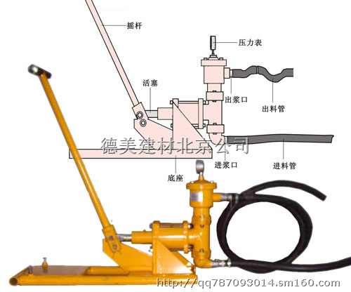 按照说明书将手动摇杆装配好。检查压力表管路内油是否充满,连接好吸料管(下部)和出料管(上部),将吸料管插入料桶,往复摇动摇杆,即可开始灌浆。