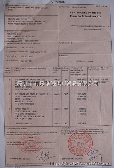 《中國-秘魯自由貿易區優惠原產地證明書》FORM R,全稱為CERTIFICATE OF ORIGIN Form For China-Peru FTA。