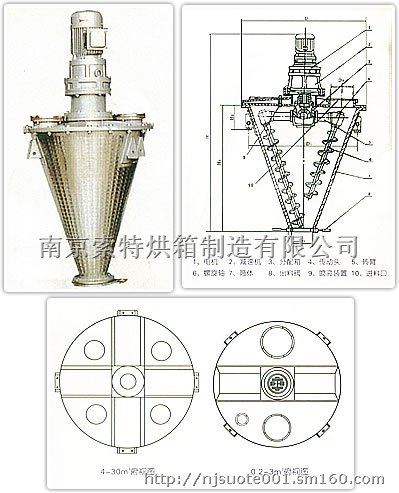 YSH-B型双螺旋锥形混合机 B型混合机结构,它由电机、减速机、简盖、螺旋部分、出料阀、喷液装置等组成 减速机 行星摆线针轮、双级、双出轴、输出公转、自转两种速度 简盖部分 简盖支撑着整个传动部件,简盖上没有若干孔进料、观察、清洗、维修用 传动部分 由减速机经传动分配箱、转臂、螺旋作行星式公转、自转两种运动 简体部分 简体为锥行结构,作乘物料用,使出料迅速、干净、不积料、无出料死角 螺旋部分 简体内两只非对称排列的悬臂,螺旋作自转、传动分配箱转臂作公转,行星运动时,在简体范围内翻动物料快速达到均匀混合。 出料阀 出料阀安装在简体底部,用于控制及放料,该出料阀可分手动、气动、电动三种结构形式,可根据用户需要加装液体出料阀(浆液阀) 喷液装置 由管件、喷头部件组成,并固定在简盖上。 技 术 参 数 | 规格型号 | YSH-0.2 | YSH-0.3 | YSH-0.5 | YSH-0.8 | YSH-1 | YSH-1.5 | YSH-2 | YSH-2.5 | YSH-3 | YSH4 | YSH-5 | YSH-6 | YSH-8 | YSH-10 | YSH-12 | YSH-15 | YSH-20 | YSH-25 | YSH-30 | 容积(m3) | 0.2 | 0.3 | 0.5 | 0.8 | 1 | 1.5 | 2 | 2.5 | 3 | 4 | 5 | 6 | 8 | 10 | 12 | 15 | 20 | 25 | 30 | 一次混合量/吨 | 0.12 | 0.18 | 0.3 | 0.5 | 0.6 | 0.9 | 1.2 | 1.5 | 1.8 | 2.4 | 3 | 3.6 | 4.8 | 6 | 7.2 | 9 | 12 | 15 | 18 | 电机功率/kw | 2.2 | 3 | 3 | 4 | 4 | 5.5 | 5.5 | 7.5 | 7.5 | 11 | 15 | 15 | 18.5 | 18.5 | 22 | 22 | 30 | 37 | 45 | 装载系数 | 0.6 | 物料细度 | 20-600 |