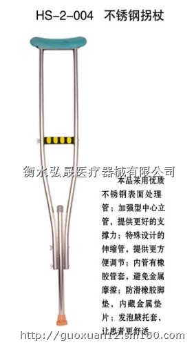 本公司产品采用优质不锈钢表面处理管,加强型中心立管,提供更好的支撑力,特殊设计的伸缩管,提供更方便调节;内管有橡胶管套,避免金属管摩擦,防滑橡胶脚垫,内置金属垫片,海绵发泡腋托和握手,让使用者更舒适。