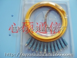 束状尾纤,又称尾纤束,只有一端有连接头,而另一端是一根光纤的断头,通过熔接与其他光缆纤芯相连,常出现在光纤终端盒内,用于连接光缆与终端设备。尾纤分为多模尾纤和单模尾纤。多模尾纤为橙色,波长为850nm,传输距离为500m,用于短距离互联。单模尾纤为黄色,波长有两种,1310nm和1550nm,传输距离分别为10km和40km。它由12根尾纤组成,颜色依次为:蓝、橙、绿、棕、灰、白、红、黑、黄、紫、粉红、浅蓝。