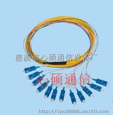 束状尾纤,又称尾纤束,只有一端有连接头,而另一端是一根光纤的断头,通过熔接与其他光缆纤芯相连,常出现在光纤终端盒内,用于连接光缆与终端设备。尾纤分为多模尾纤和单模尾纤。多模尾纤为橙色,波长为850nm,传输距离为500m,用于短距离互联。单模尾纤为黄色,波长有两种,1310nm和1550nm,传输距离分别为10km和40km。它由12根尾纤组成,颜色依次为:蓝、橙、绿、棕、灰、白、红、黑、黄、紫、粉红、浅蓝。