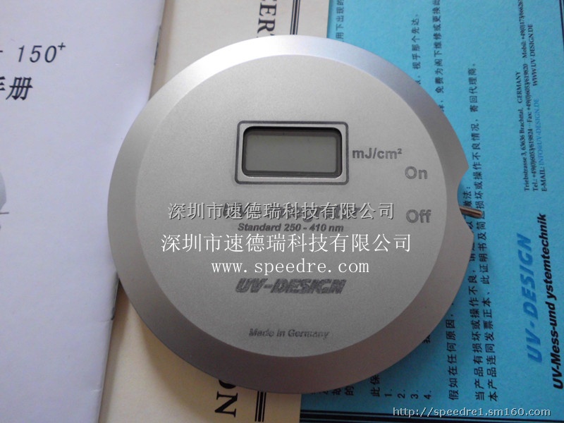UV能量计( UV-int150+ ): UV-int150+耐高温UV能量计是一种高质量的UV能量测量仪。UV能量计是用于测量UV固化装置的UV能量的一种仪器,测量仪的主感器在测量仪的背面,测量范围为250~410纳米,测量时可直接显示于能量计正面的显示屏上读出(单位:毫焦耳/平方厘米),UV-Int150+ UV能量计的电源为3.6伏特殊耐高温125度电池,该电池由于使用了特别的能源节省线路,该电池可持续大约5000小时。UV-int150+耐高温UV能量计技术数据