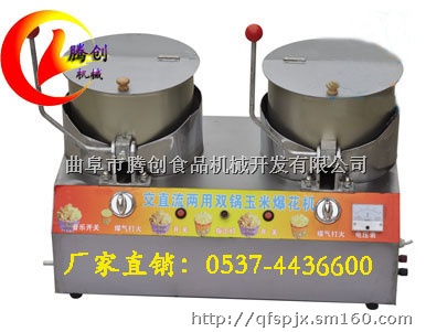 交直流两用双锅玉米爆花机,以液化气为热源,交流220v或者12v电瓶为搅拌动力,一人就可以操作方便流动。机器采用不锈钢板压模成型,内置钢支架、电子点火、火力大小可调,火势均匀节约液化气,双锅玉爆花机,双灶头控制,各自独立工作,互不干扰。