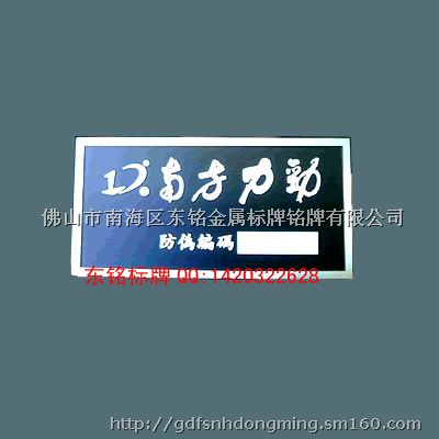 广东省佛山市东铭五金标牌铭牌制作13380228986专制铝标牌也叫高光铝标牌.又叫压铸铝铭牌一般采用金属铝做原材料.标牌大小可根据客户实际的需求,厚度一般在1MM到3MM,字体或LOGO一般凸起来0.3-1.8MM,表面有拉丝条纹路,有折光效果,立体效果相当强的一种金属标牌.