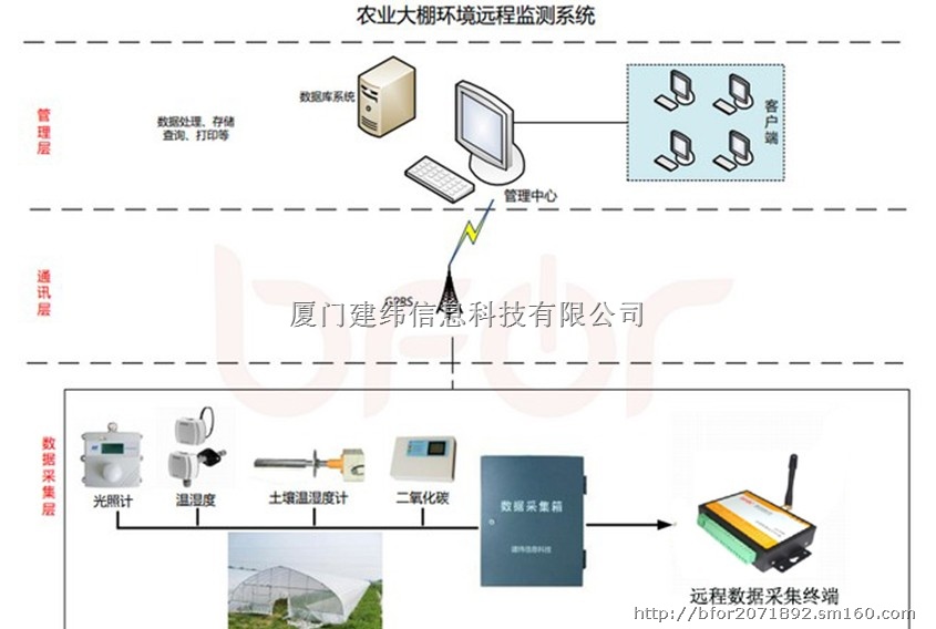 厦门建纬信息科技有限公司农业大棚环境远程监控系统由前端部分来完成对环境监测因子的含量的监测与汇总、转换、传输等工作,监测因子包括温度、湿度、光照、土壤温度、土壤湿度、CO2浓度、叶面湿度、露点温度等环境参数,这些监测因子由数据采集终端使用不同的方法进行测量获得一个非常准确的测量数据,此结果通过数据处理转换后经由GPRS网络向在线监测数据平台传输数据,在线监测数据传输平台来实现数据的接收、过滤、存储、处理、统计分析并提供实时数据查询等任务,当温湿度超过设定值的时候,自动开启或者关闭指定设备。整个系统可达到:安全、可靠、准确、实时、全面、快速、高效的将真实的农业温室大棚种植环境信息展现在管理人员的面前。