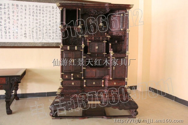 福建仙游红景天红木家具厂专业生产小叶紫檀家具,此套小叶紫檀龙凤多宝格,根据故宫提供的图纸选用 印度小叶紫檀木、仿明清式宫廷家具精雕细琢精工制作而成,制作工艺采用传统的榫头结构,本产品100%选用正宗印度小叶紫檀木老料精制而成
