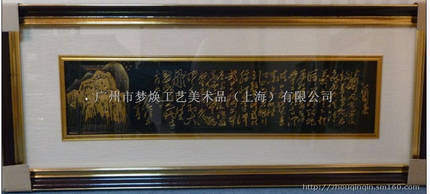 黄铜板手工雕刻镀金工艺画(简称金雕画)其画面是以优质黄铜板为原料,在黄铜板上纯手工雕刻出精美图文,图文部分电镀24K金。该产品材质贵重、做工精细、手工雕刻工艺性强。其画面金光灿灿、富丽堂皇。堪称为难得的艺术瑰宝。