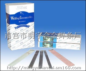 Category类 别Trade-Mark牌 号Equivalent to China Standard相当国标Characteristics & application特性和用途Equivalent to AWS相当AWSHard-surfacing硬面堆焊D 667 EDZCr-B-15 HRc≥48. Resistance to wear, gas corrosion and oxidation. Hardfacing of blast furnace hopper and cracker part.HRc≥48,耐磨、耐气蚀、抗氧化。堆焊高炉料钟、破碎机件 D 802 EDCoCr-A-03 HRc38-47. Resistance to heat, wear and corrosion. Hardfacing of high temperature part such as the edge of thermo-cutter.HRc38-47,耐热、耐蚀、耐磨。堆焊高温工件如热剪切刀刃ECoCr-A D 812 EDCoCr-B-03 HR5-50. Resistance to heat, wear and corrosion. Hardfacing of high temperature part such as internal-combustion engine valve.HR5-50,耐热、耐蚀、耐磨。堆焊高温工件如内燃机阀ECoCr-B D 822 HRc≥53. Resistance to Wear and heat, bad shock resistance. Hardfacing of rotating blade wheel of boiler.HRc≥53,耐热、耐磨,但抗冲击性差。堆焊锅炉旋转叶轮 D 832 EDCoCr-C-03 HRc≥50. Wear and heat resistance. Hardfacing of high temperature part such as hot-rolling guided way.HRc≥50,耐热、耐磨。堆焊高温工件如热轧导轨ECoCr-C D 842 EDCoCr-D-03 HRc28-38. Corrosion and thermo-fatigue resistance, work harding. Hardfacing of hot forging die.HRc28-38,耐蚀、抗热疲劳,具有加工硬化性。堆焊热锻模 Cast iron铸铁 Z 308 EZNi Pure nickel, excellent general properties. Used to weld thin cast iron part and repair welding machined surface, such as guided way of machine tool.纯镍,综合性能好。铸铁薄件及加工面补焊用,如机床导卫ENi-Cl Z 408 EZNiFe Iron nickel, high strength and excellent ductility. Repair welding of important gray cast iron and nodular cast iron, such as cylinder cap.镍铁,强度高、塑性好。重要灰铸铁及球铁焊补用,如汽缸盖ENiFe-Cl Z 508 EZNiCu-1 Copper nickel, good machinability and bad crack resistance. Repair welding of sand hole and gray cast iron machined surface subject to no load.镍铜,易加工,但抗裂性较差。不受力的灰铸铁加工面及砂眼补焊ENiCu-B Copper alloys铜合金 Cu 107 ECu Red copper, atmosphere and sea water corrosion and excellent electric conductivity. Welding of red copper such as electrical copper row.紫铜,耐大气,海水腐蚀,导电性好。紫铜焊接用,如导电铜排ECu Cu 207 ECuSi Silicon bronze, corrosion resistance and high strength. Welding of copper, silicon bronze and brass.硅青铜,耐蚀、强度高。铜、硅青铜及黄铜焊接用ECuSi Cu 227 ECuSnB Tin phosphor bronze, corrosion resistance and high strength. Welding of copper, silicon bronze and brass.锡磷青铜,耐蚀、强度高。铜、硅青铜及黄铜焊接用ECuSn-C Cu 237 ECuAl Aluminum bronze, wear and corrosion and high strength. Welding or surfacing of copper alloys.铝青铜,耐磨、耐蚀,强度高。铜合金焊接或堆焊用ECuAl-A2 Aluminum alloys铝合金 Al 109 TAl Pure aluminum, excellent corrosion resistance and middle strength. Welding of pure aluminum.纯铝,耐蚀性好,但强度不高,纯铝焊接用E1100 Al 209 TAlSi Silicon aluminum, good crack resistance and wide range of usage. Welding of aluminum alloys other than aluminum magnesium alloys.铝硅,抗裂性好,通用性大。铝合金焊接用,不宜焊接铝镁合金E4043 Al 309 TAMn Manganese aluminum, corrosion resistance and high strength. Welding of aluminum alloys.铝锰,强度高,耐蚀。铝合金焊接用E3003 Nickel alloys镍合金 Ni 102 ENi-1 Pure nickel. Welding and surfacing of nickel and nickel to steel.纯镍,用于镍、镍与钢的焊接与堆焊ENi-1 Ni 207 ENiCu-7 Copper nickel. Welding and surfacing of copper nickel and copper nickel to steel.镍铜,用于镍铜、镍铜与钢的焊接与堆焊ENiCu-7
