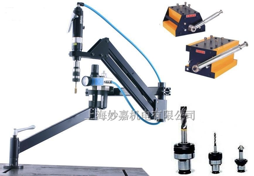 “妙嘉牌”气动攻丝机采用压缩空气驱动,安全快速高效;较小气压力和气量(0.3-0.8mpa),超大扭力输出;.能对各种钢材、铁、铜、铝、塑料等材料攻丝;筒夹带过载保护装置,丝攻损伤较少,螺牙精度高;操作简单轻便,完全不需要经验和力量;加工成本较使用CNC加工中心,铣床带攻丝器或手动攻丝低许多;较重的工作物不需要定位装置或移动,工作面积特大(半径100-2100mm范围内);定位迅速快和较高的切削速度,增加生产量;透孔或盲孔,丝攻均不致断裂、垂直、水平(万向)角度均能攻丝;加工范围大:(M2-M24)。产品,使用寿命的保证。