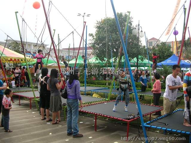 我公司生产的儿童蹦极设备是当今最流行,最时尚的,儿童健康娱乐运动器材。其占地面积小,使用方便,不需用电,不受场地限制,公园,广场,商场,室内室外均可使用。安装拆卸方便灵活,安装牢固,运输方便。儿童可以在空中自由飞,还可以在空中做360度,720度前后翻转,等空中各种动作.它是提高儿童综合素质的最好游乐器材之一。一经推出便深受好评,不但给游客带来了欢乐,也给经营者带来了丰厚的收益。