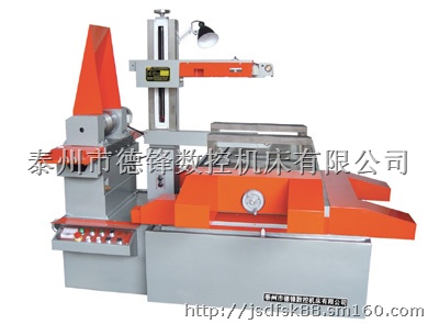 产品介绍德锋线切割数控机床的特点:1. 选用配对无间隙轴承,提高精度。2. 线架上装导向器,减少钼丝抖动,提高稳定性。3. 选用优质滚珠丝杆4. 采用线性导轨5. 良好的装配工艺要求6. 采用变频器,电脑可编程器,可以任意调节运丝滚筒速度,从而提高工件光洁度。7. 采用来回往复式切割(进六退四)(专利),提高光洁度,此方法有一弊病是降低了切割效率(大约在普通线切割效率基础上降低20%~30%)。 产品属性电火花线切割加工机床根据电极。丝运行速度不同分为快走丝和慢走丝两种机床,所谓“中走丝”并非指走丝速度介于高速与低速之间,而是复合走丝线切割机床,其走丝原理是在粗加工时采用8-12m/s高速走丝,精加工时采用1-3m/s低速走丝,这样工作相对平稳、抖动小,并通过多次切割减少材料变形及钼丝损耗带来的误差,使加工质量也相对提高,加工质量可介于高速走丝机与低速走丝机之间。因而可以说,用户所说的“中走丝”,实际上是往复走丝电火花线切割机借鉴了一些低速走丝机的加工工艺技术,并实现了无条纹切割和多次切割。我公司生产的dk7720线切割机/线切割,有中走丝和快走丝两种线切割。其他说明线切割机/线切割组成主要包括:1)主机:包括床身、坐标工作台、走丝机构等;2)脉冲电源:把交流电流转换成一定频率的单向脉冲电流; 3)控制系统控制机床运动;4)工作液循环系统:提供清洁的、有一定压力的工作液。交易说明正常订货周期为七天到十天,国内我方负责送货到需方