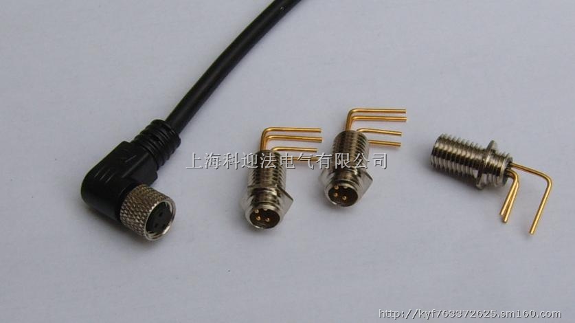 M8公头为直型,或为90度弯型。可以预制电缆,或不带电缆。电缆种类PVC,PUR,TPU等。带线的有弯型。芯数为3针、4针。4芯位置呈梯形分布。