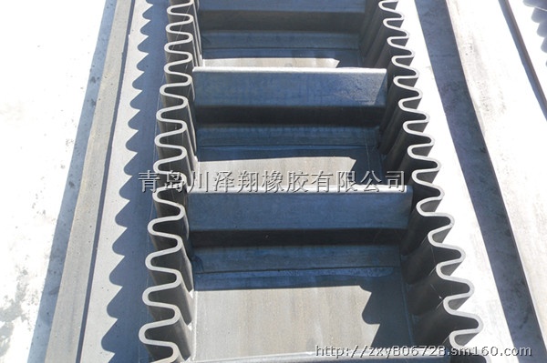 大倾角挡边输送带又叫裙边隔板输送带,是有基带.挡边.横隔板3部分组成。挡边起防止物料侧滑撒落的作用。为便于绕过滚筒,挡边设计成波纹状;横隔板的作用是承托物料.为了实现大倾角输送,采用T型TC型.。挡边和隔板是用二次硫化的方法与基带连接的,具有很高的连接强度。用于输送易散落的粉状.粒状.小块状.糊状及液态状物料。