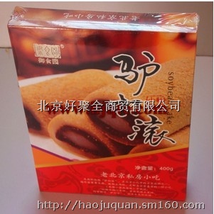 豆面糕又称驴打滚,是北京小吃中的古老品种之一,源于满洲。它的原料是用黄米面加水蒸熟,和面时稍多加水和软些。另将黄豆炒熟后,轧成粉面。制作时将蒸熟发黄米面外面沾上黄豆粉面擀成片,然后抹上赤豆沙馅(也可用红糖)卷起来,切成100克左右的小块 ,撒上白糖就成了。制作时要求馅卷得均匀,层次分明,外表呈黄色,特点是香、甜、粘,有浓郁的黄豆粉香味儿。豆面糕以黄豆面为其主要原料,故称豆面糕。但为什么又称“驴打滚”呢?似乎是一种形象比喻,制得后放在黄豆面中滚一下,如郊野真驴打滚,扬起灰尘似的,故而得名。这一点连前人也发出疑问。《燕都小食品杂咏》中就说:“红糖水馅巧安排,黄面成团豆里埋。何事群呼‘驴打滚’,称名未免近诙谐。”还说:“黄豆粘米,蒸熟,裹以红糖水馅,滚于炒豆面中,置盘上售之,取名‘驴打滚’真不可思议之称也。”可见“驴打滚”的叫法已约定俗成。如今,很多人只知雅号俗称,不知其正名了。现各家小吃店一年四季都有供应,但大多数已不用黄米面,改用江米面了,因外滚黄豆粉面,其颜色仍为黄色,是群众非常喜爱的一种小吃