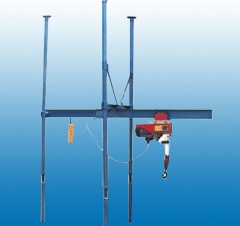 2、支架部分由螺杆,千斤螺母及立杆构成的主杆和转动臂组成。转动臂可在主杆上转动360度,在臂端设有行程开关以防操作失误或按钮失灵而造成的起吊过位事故。操作按钮起动器实现电机正反转可将钢丝绳卷绕、放开,并通过支架部分滑轮起吊,下放物件来完成吊运作业。