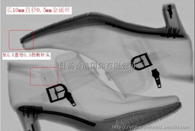 日畅公司是国内专业鞋子x光射线异物检测仪设备生产商,专业检测出口皮鞋、马靴、时装鞋、等各种鞋类商品中隐藏铁,针,钉等尖锐异物。避免因为人工失误而导致的质量风险。采用进口配置,检测图像清晰精确,确保出口鞋子的品质。