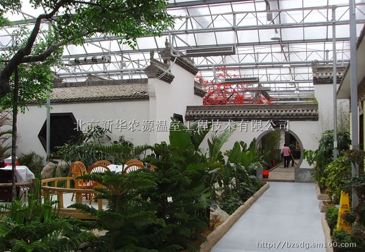 从结构上看,就是温室,从配套设施看,餐厅内不仅要能为植物生长营造一个适宜的气候,更重要的是要为人在此就餐制造一个舒适的环境。餐厅的面积一般都在几千平方米左右,无论是就餐环境还是食物都体现一个“绿色”的概念。首先,环境是绿色的。超大的就餐空间被有序的植株隔开,这样就很好的解决了传统餐厅人多嘈杂的感觉。人们在鲜花绿树的簇拥下,可以使感官得到最大的享受。如果你再细细观察,会发现在你周围的植物身上被明确的标注了该物种的名称、特性和实用价值,也许这正是中国人饮食文化的最好体现。再者,食物是“绿色”的,蔬菜的栽培就在餐厅周围的生产用温室里,如果你愿意可以直接现摘现吃。