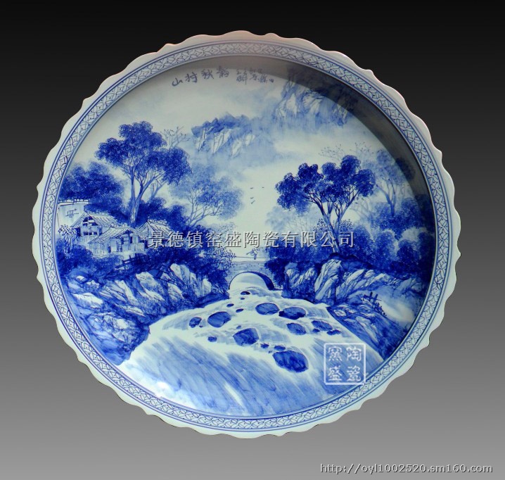 此款青花瓷盘为全手工山村秋云瓷盘,此盘尺寸直径为1.5米,盘子边缘为手工拉制花边,画面上描绘着秋天山村的美景