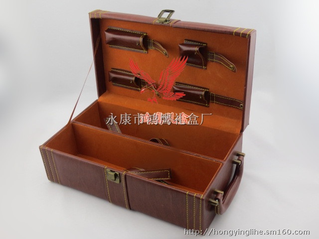 厂家直销高档双支装棕色款红酒包装皮酒盒,内含酒具4件套